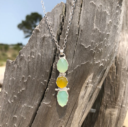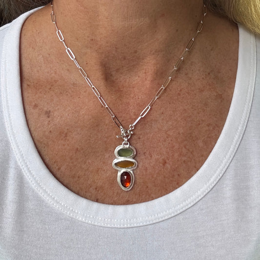 Amber and Green Sea Glass & Garnet Toggle Paperclip Necklace