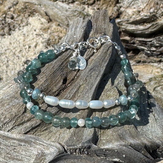 Blue Apatite, Pearl & Sapphire double strand Bracelet