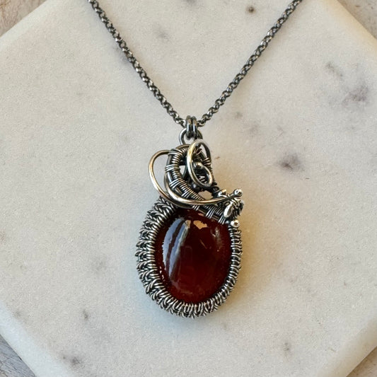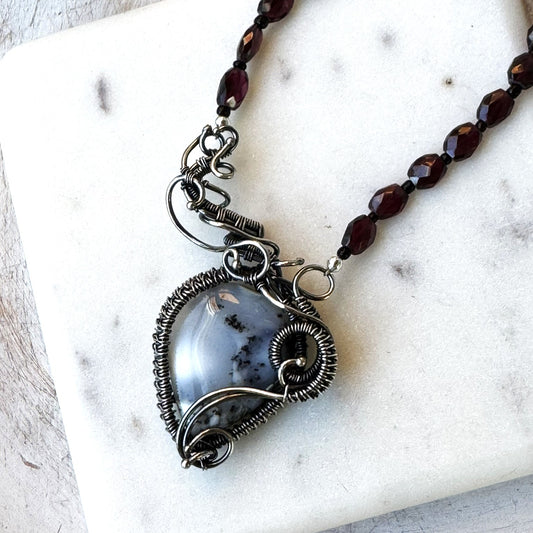 Dendrite Teardrop & Garnet Silver Woven Necklace