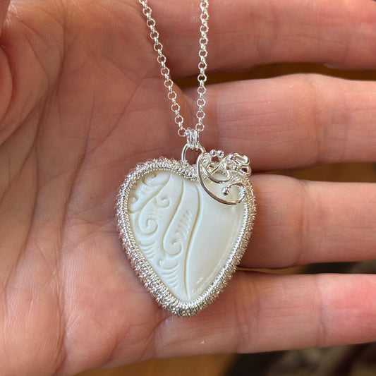 Carved Buffalo Bone Woven Silver Heart Necklace