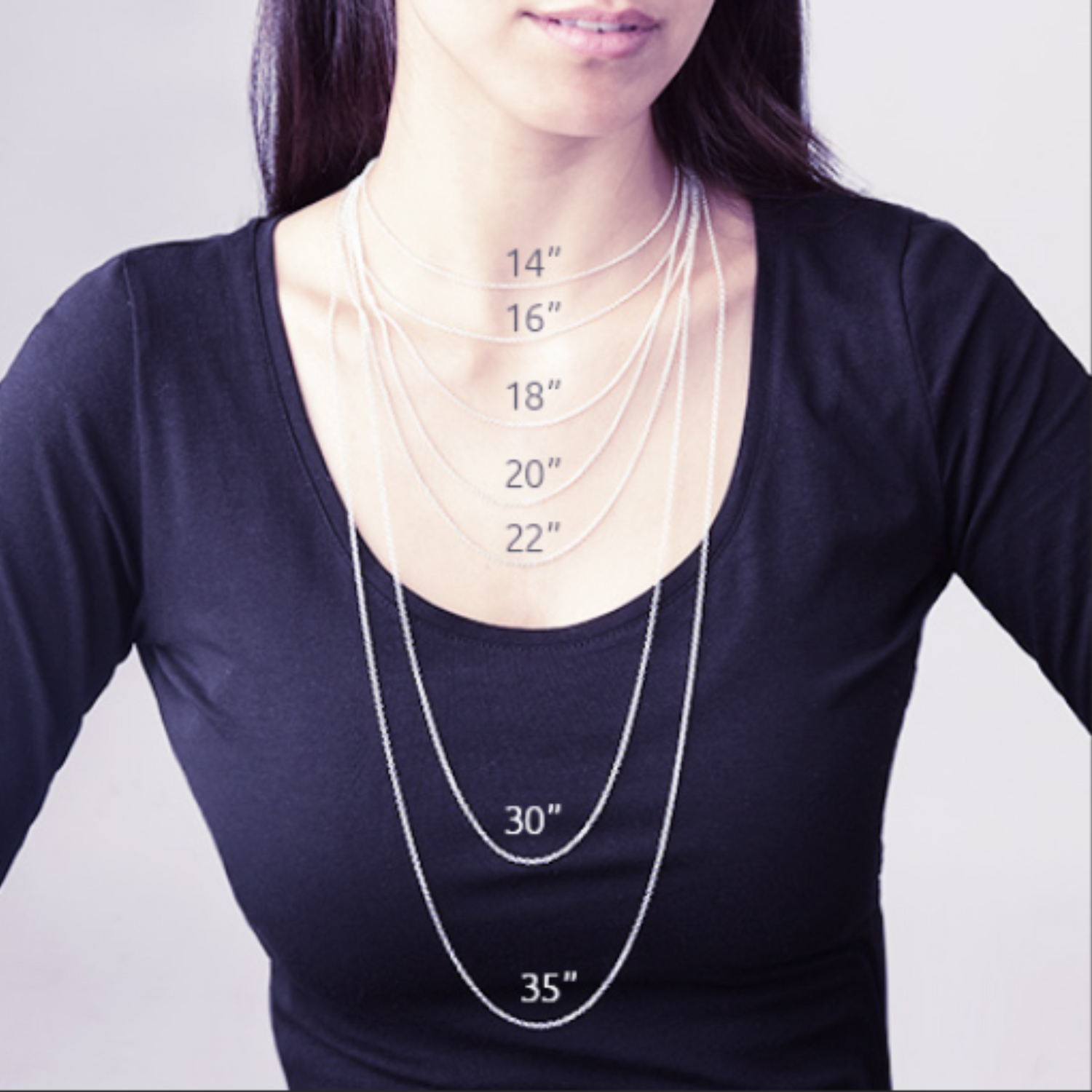 Necklace measurements are determined based on chain lengths. To measure an existing necklace, determine the length by using a ruler or tape measure from one end of the clasp to the other.