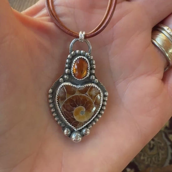 - Warm gemstones set in sterling silver patina'd to enhance the design elements.