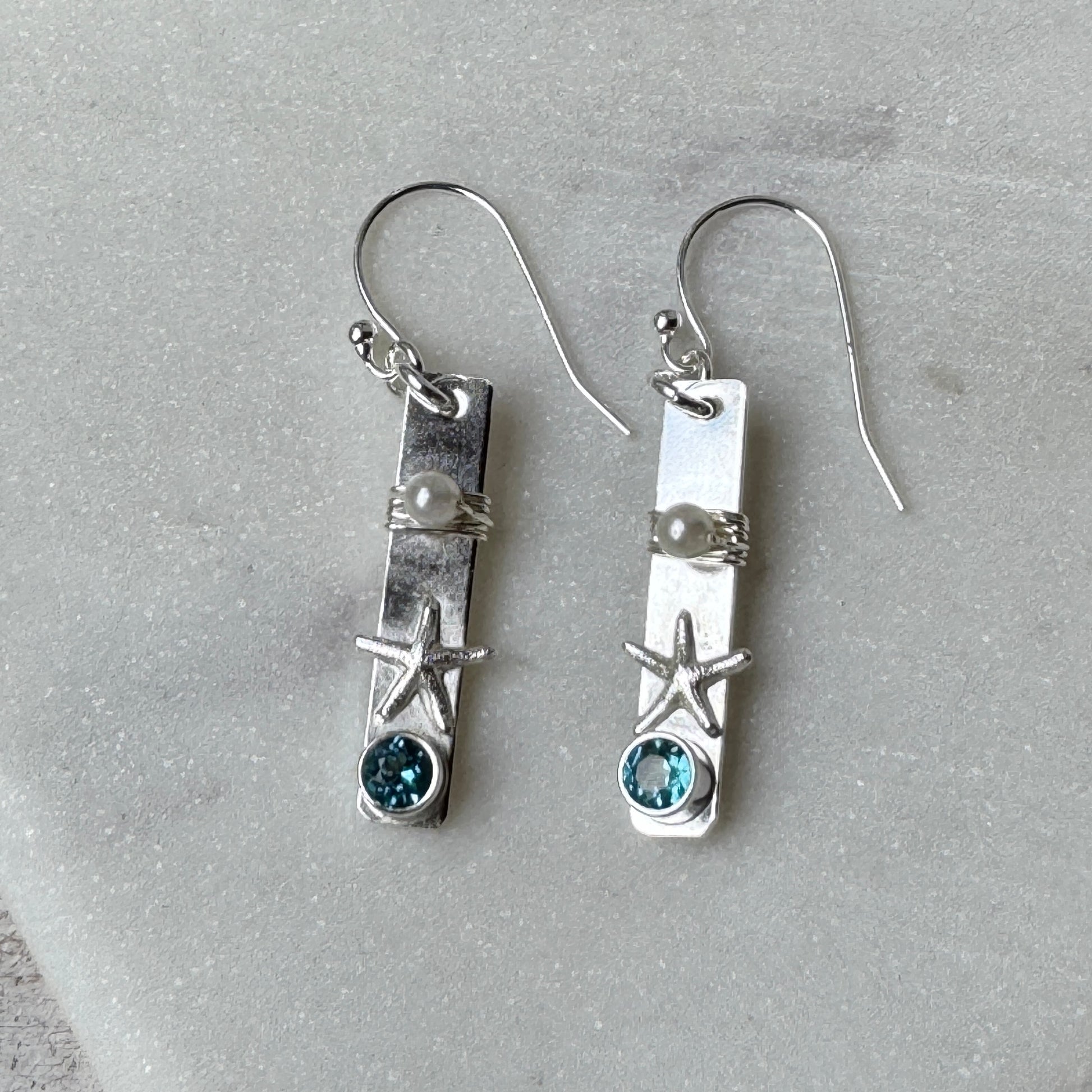 - Swiss blue Topaz gemstones, silver starfish and freshwater Pearls on a sterling silver rectangular bar.