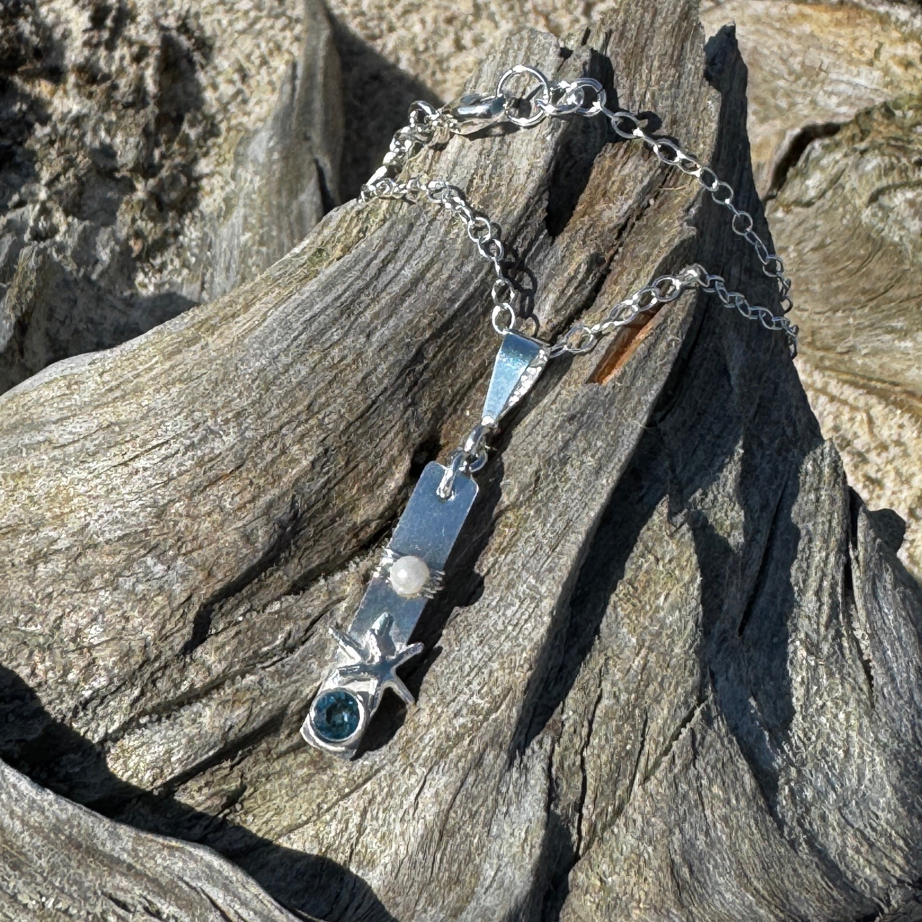 - Bar style pendant contains 2 playful sterling silver Starfish, a facet cut london blue Topaz and freshwater Pearl.