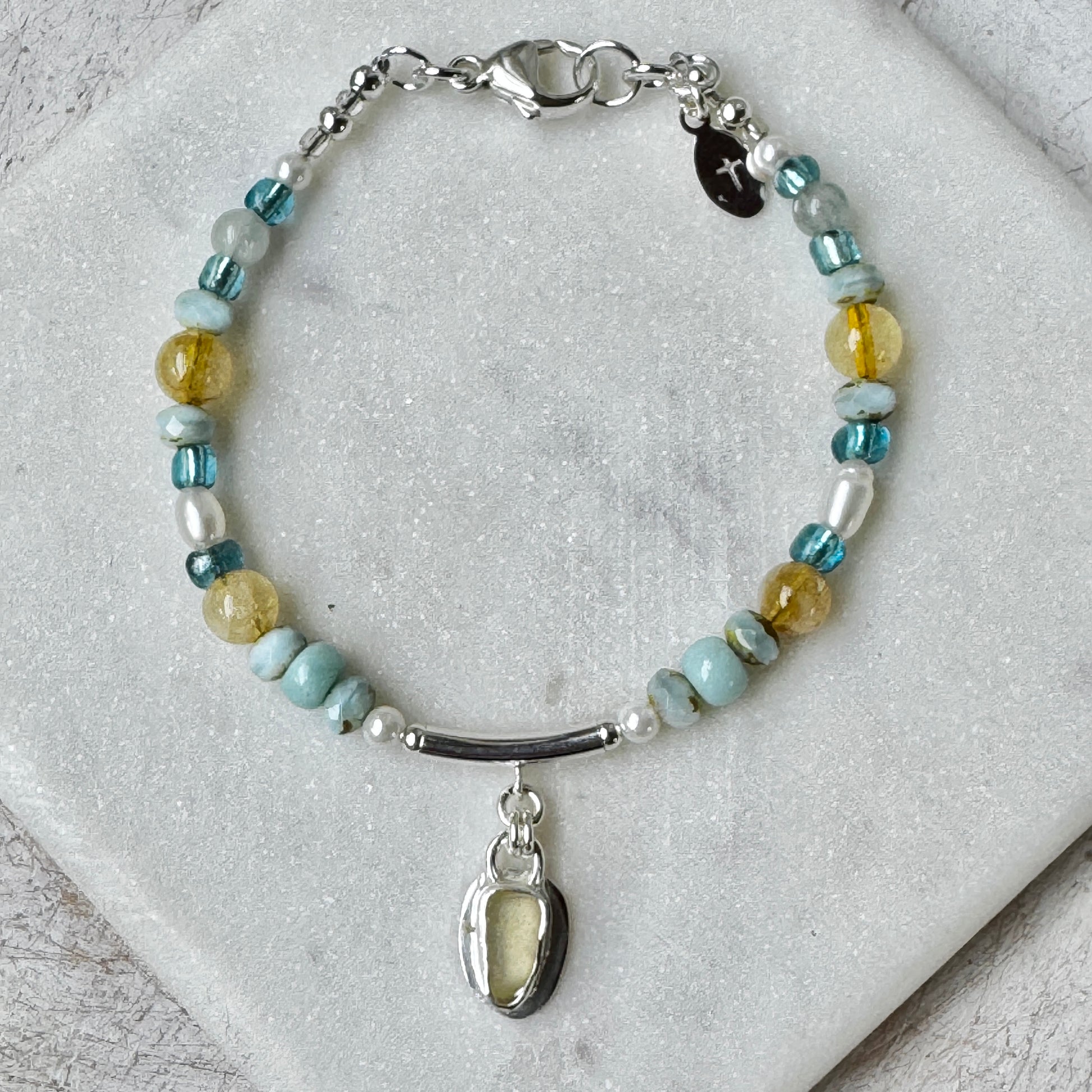Citrine, Larimar & Pearl Bracelet with Yellow Sea Glass Charm