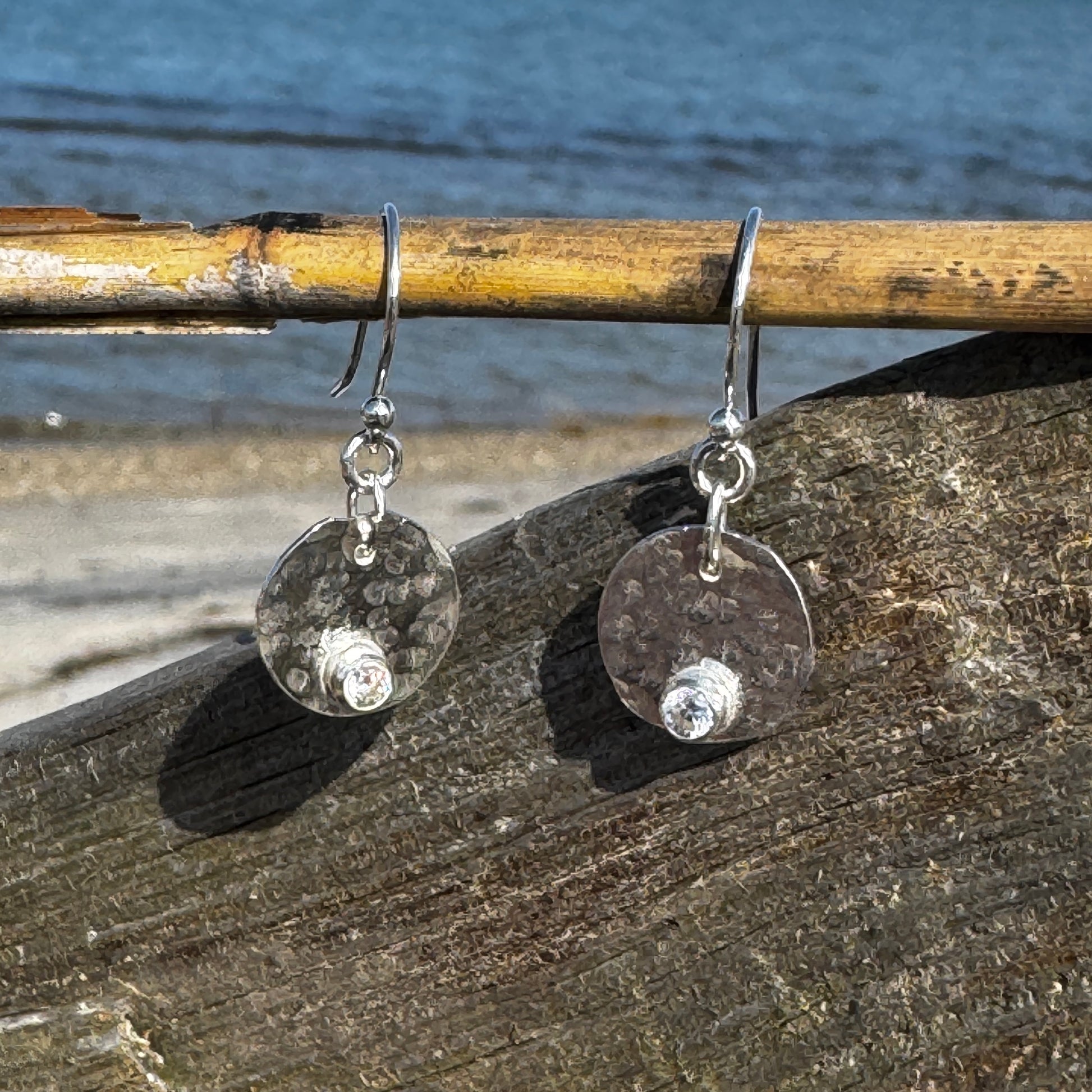- Sparkling clear CZ stones are nestled in hammered domed sterling silver cups