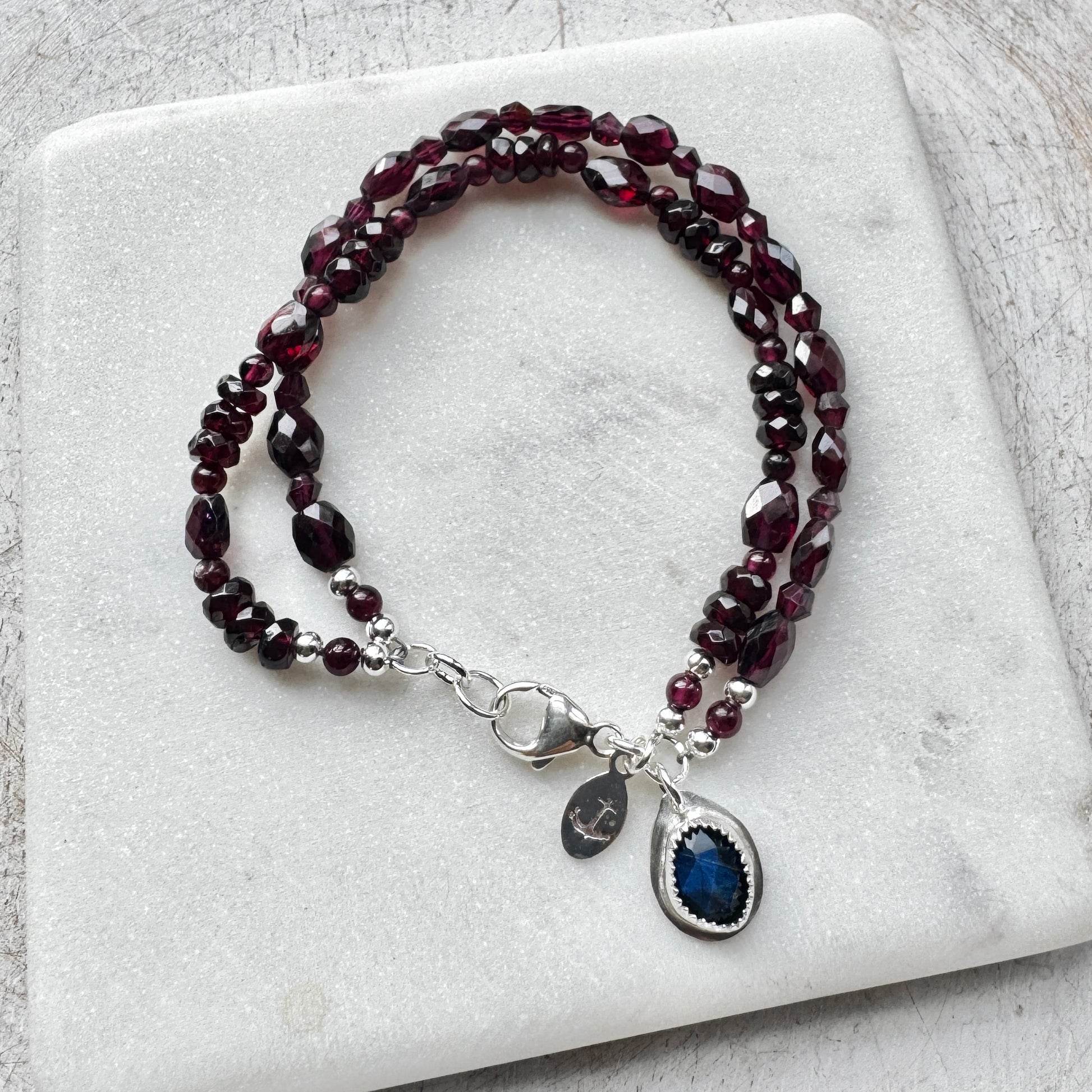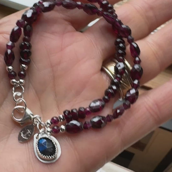 - Two rows of facet and smooth cut ruby red Garnets that capture the light.