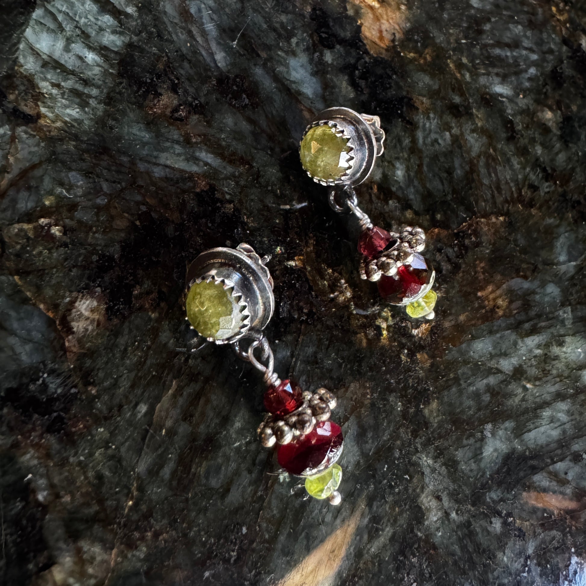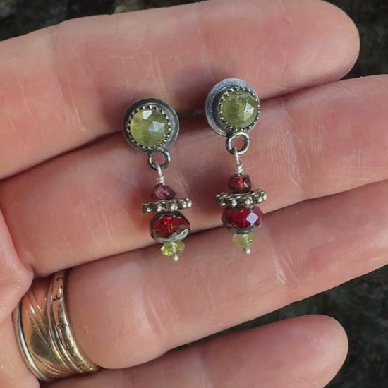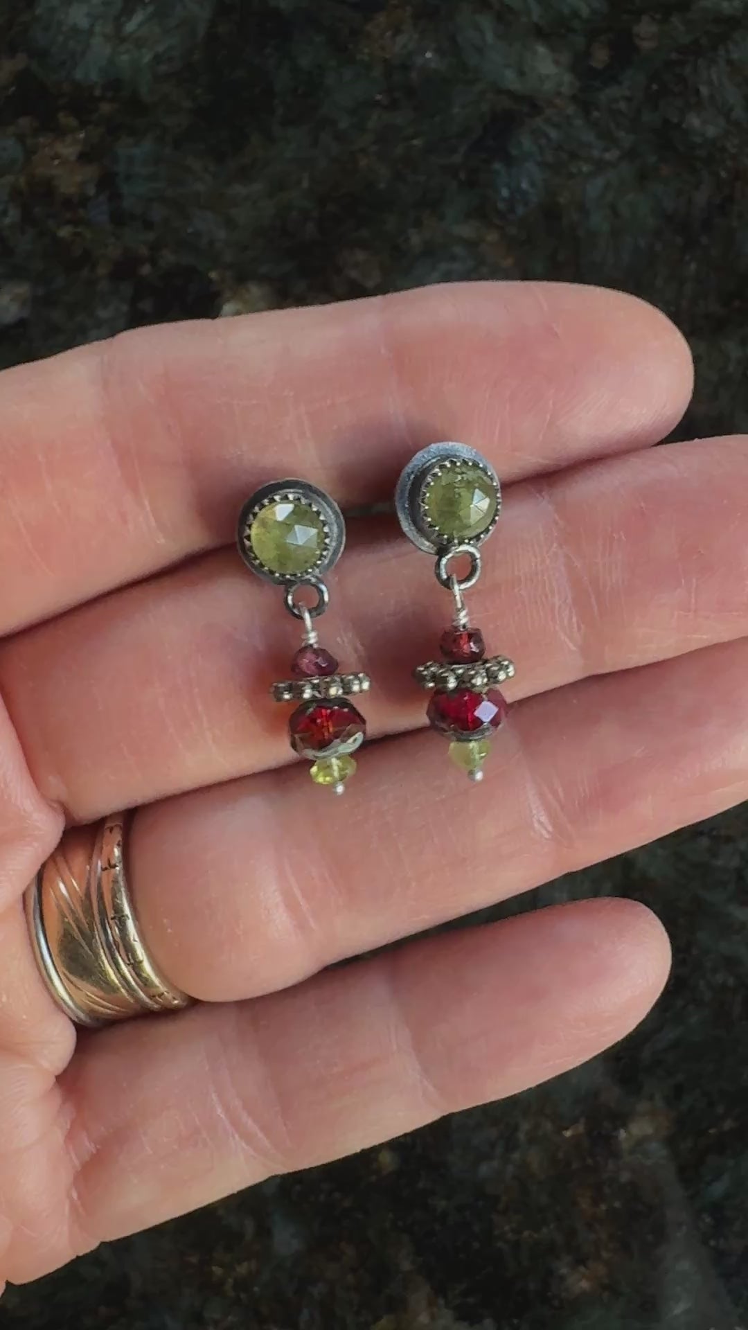 - Facet cut green Gossular and ruby red Rhodolite Garnets paired with green Peridot and carnival czech glass.