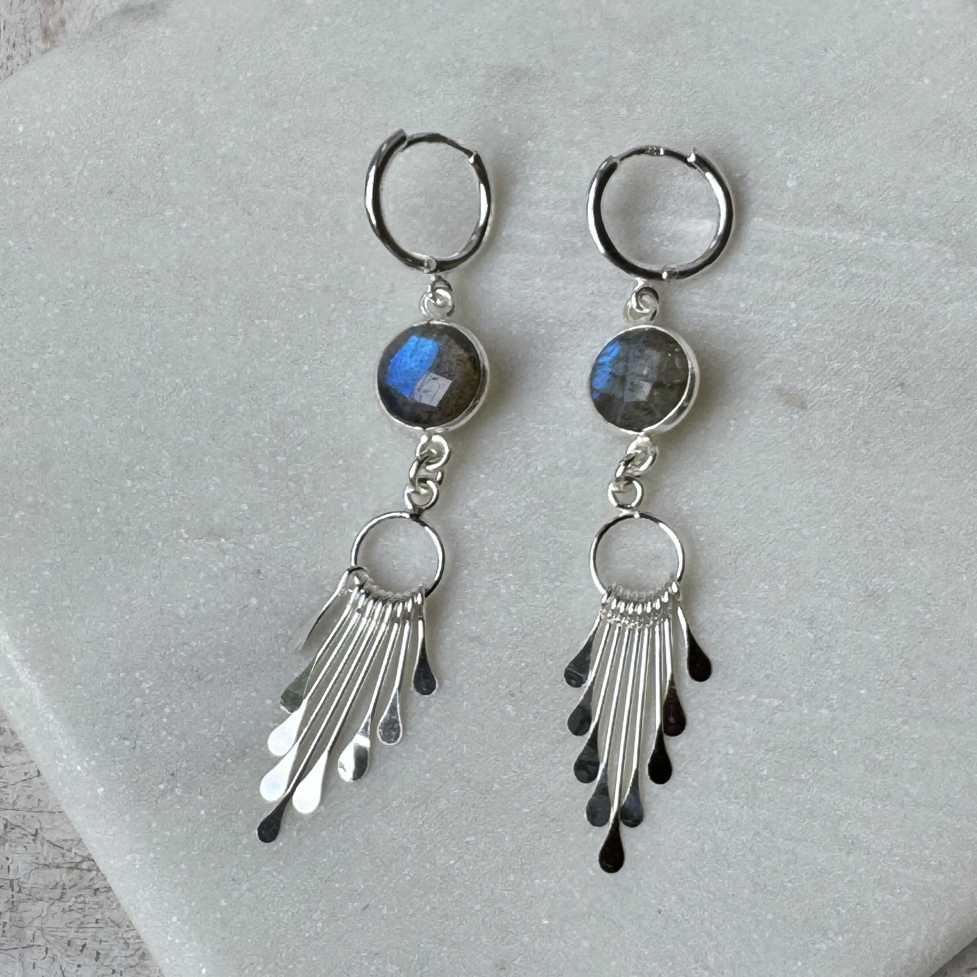 - Navy blue flash Labradorite with a bright sterling silver paddle fringe bottom