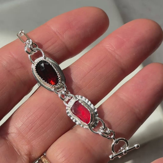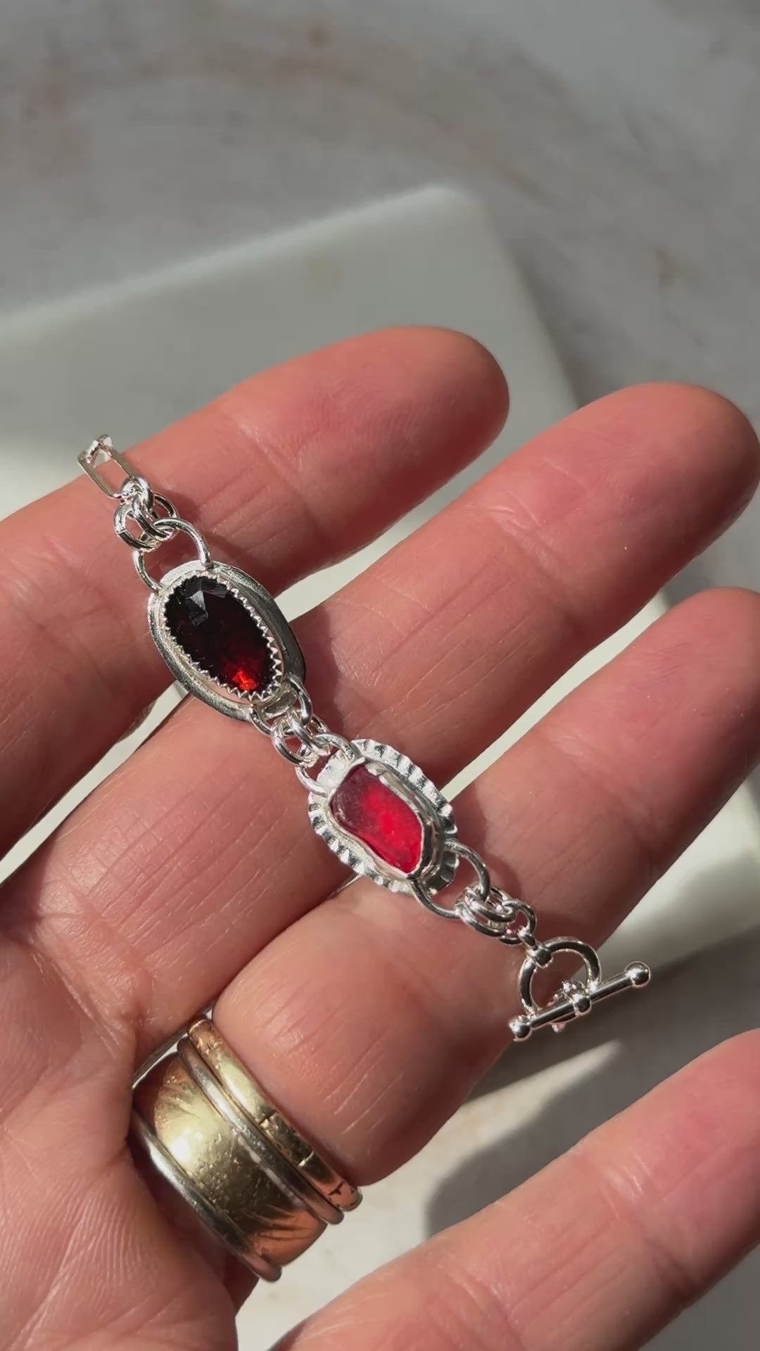 Red Sea Glass & Garnet Silver Toggle Paperclip Bracelet