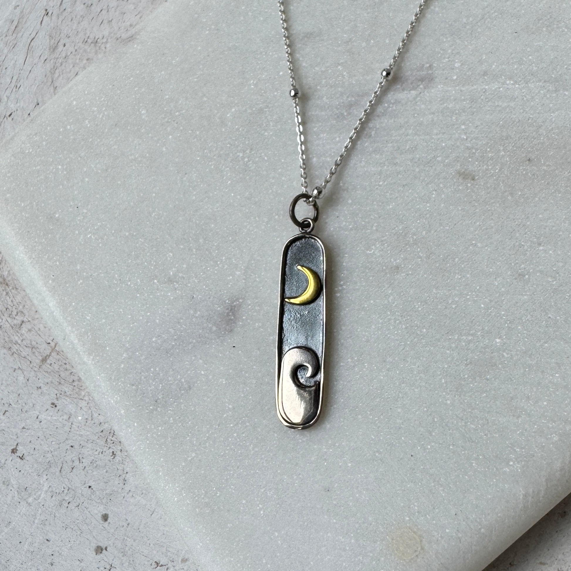 - A silver wave crests under a brass crescent moon in this rectangular pendant.
